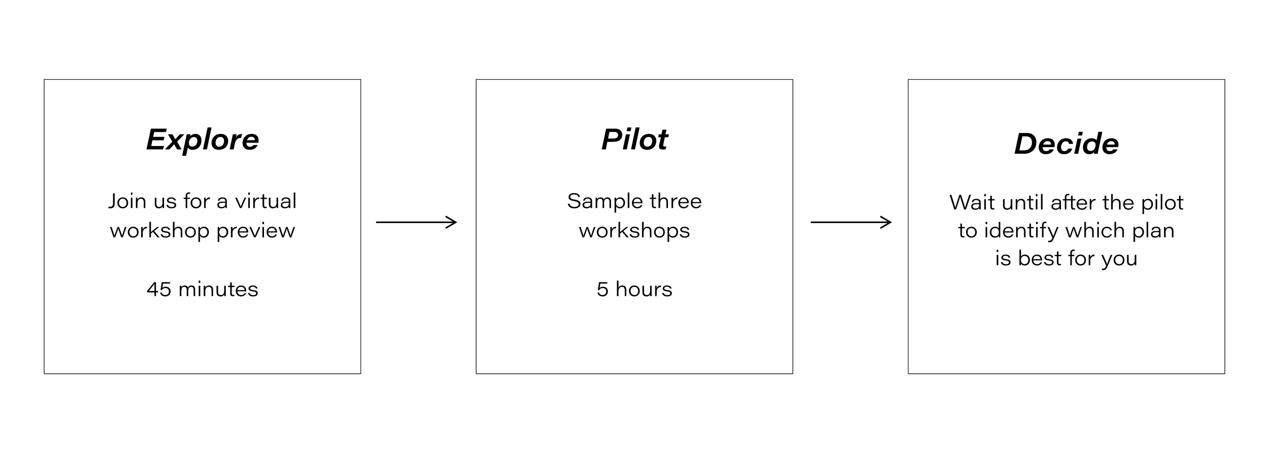 The pilot process is a one-day, in-person sampling of the resources and workshops selected. Leaders experience the value realized by various roles and identify which plan is best suited for their organization.